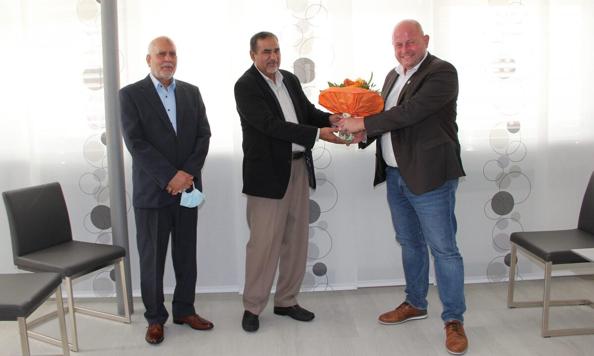 Riedstadt – Für einen nachgeholten Neujahrsgruß kamen zwei Vertreter der Ahmadiyya-Muslim-Gemeinde der Baitul Aziz Moschee in Goddelau ins Riedstädter Rathaus. Dabei überreichten Shakoor Abdul und Mumtaz Ahmad Bürgermeister Marcus Kretschmann einen Blumenstrauß.
