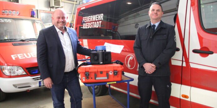 RIEDSTADT – Einen feuerwehrroten Koffer mit einer mobilen Lautsprecheranlage übergab jetzt Bürgermeister Marcus Kretschmann an Stadtbrandinspektor Markus Kölsch. Sie verbessert die Warnung und Information der Bevölkerung im Falle von Unglücksfällen und Katastrophen.