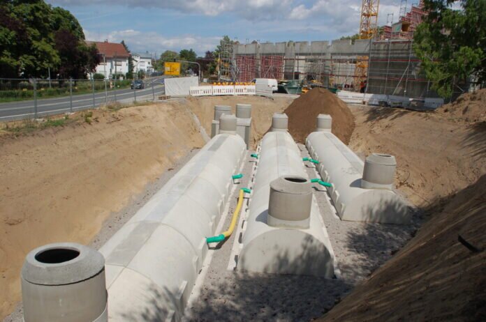 Eine weitere Grube entsteht im direkten Anschluss. Dort wird als nächstes der Eisspeicher eingebaut, der als Teil der Heizungsanlage zum regenerativen Energiekonzept des Forums gehört. Eine 21 Meter lange und 11,5 Meter breite Baugrube wurde im Juni an der Baustelle vor dem dreiteiligen Gebäudeensemble ausgehoben, deren Erdaushub anschließend auf das gemeindeeigene Grundstück am Zeppelinweg zur Zwischenlagerung gebracht wurde. In der Grube wurden drei Regenwasser-Pufferspeicher eingebaut, deren Röhren-Bauteile wie U-Boote aus Beton anmuten. Die sogenannte Tunnelrigolenanlage ähnelt in ihrer Funktion einem Regenrückhaltebecken und dient der nachhaltigen Versickerung von Regenwasser. Große Niederschlagsmengen werden den Rigolen über Halbschalen im Boden sowie über Sammelleitungen von den Dächern der Forumsgebäude zugeführt und in den miteinander verbundenen Röhren verteilt. Das Wasser wird dann nach und nach entsprechend der Versickerungsfähigkeit des Bodens dem Erdreich und damit dem Grundwasser wieder zugeführt, ähnlich wie beim natürlichen Wasserkreislauf.