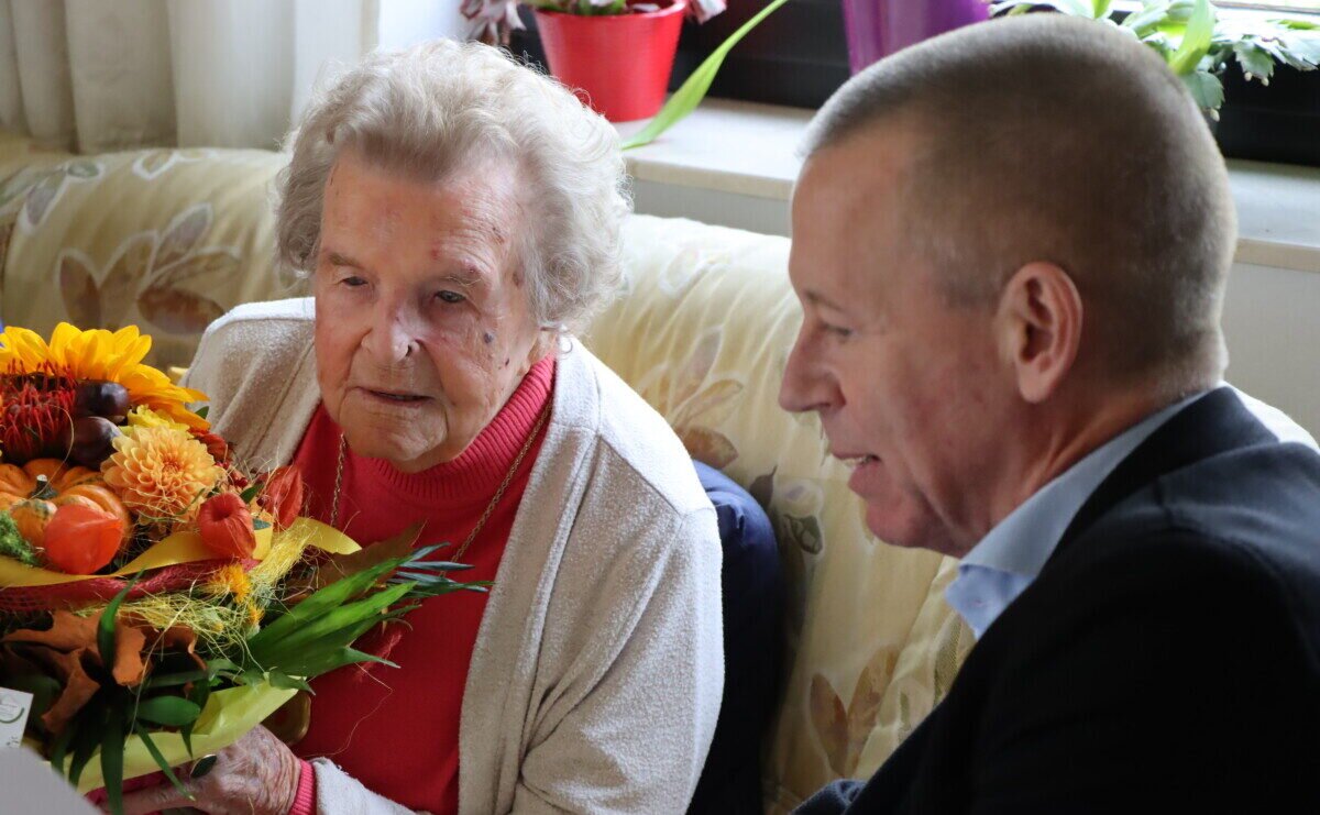 Mittags schauten Landrat Thomas Will und Bürgermeister Erhard Walther zum Gratulieren vorbei. Sie brachten Blumen und Urkunden, wünschten der Jubilarin – die die zweitälteste Einwohnerin der Kreisstadt ist – alles Gute und Wohlergehen für die Zukunft.