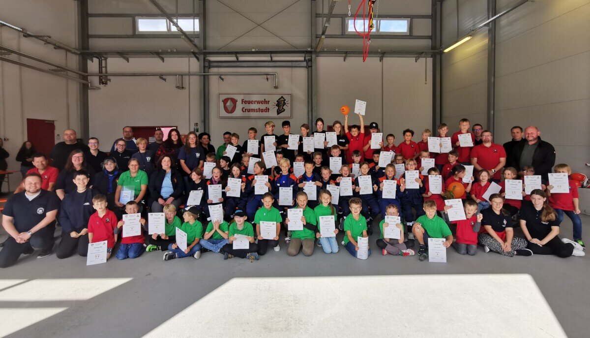 RIEDSTADT – Im und vor dem Feuerwehrhaus Riedstadt-Crumstadt herrschte am Samstag, 23. September, emsige Geschäftigkeit: 61 Mädchen und Jungen der Kinderfeuerwehren aus den Stadtteilen Crumstadt, Goddelau, Leeheim und Wolfskehlen absolvierten an vier Stationen hoch konzentriert Prüfungen zur Abnahme des Kinderfeuerwehrabzeichens „Tatze“.