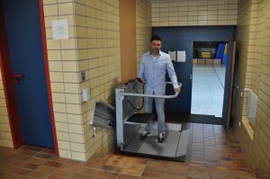 Die Duschräume sind weiß gefliest. Es gibt ein Behinderten-WC. Überhaupt spielte die Herstellung der Barrierefreiheit in Hinblick auf die Kooperationsklassen in der Schillerschule eine große Rolle bei dem Sanierungsvorhaben: Die Eingangstür lässt sich mit einem Schalter öffnen, die Stufen hinab zur Halle können Rollstuhlfahrer*innen nun mit Hilfe eines Treppenlifts überwinden.