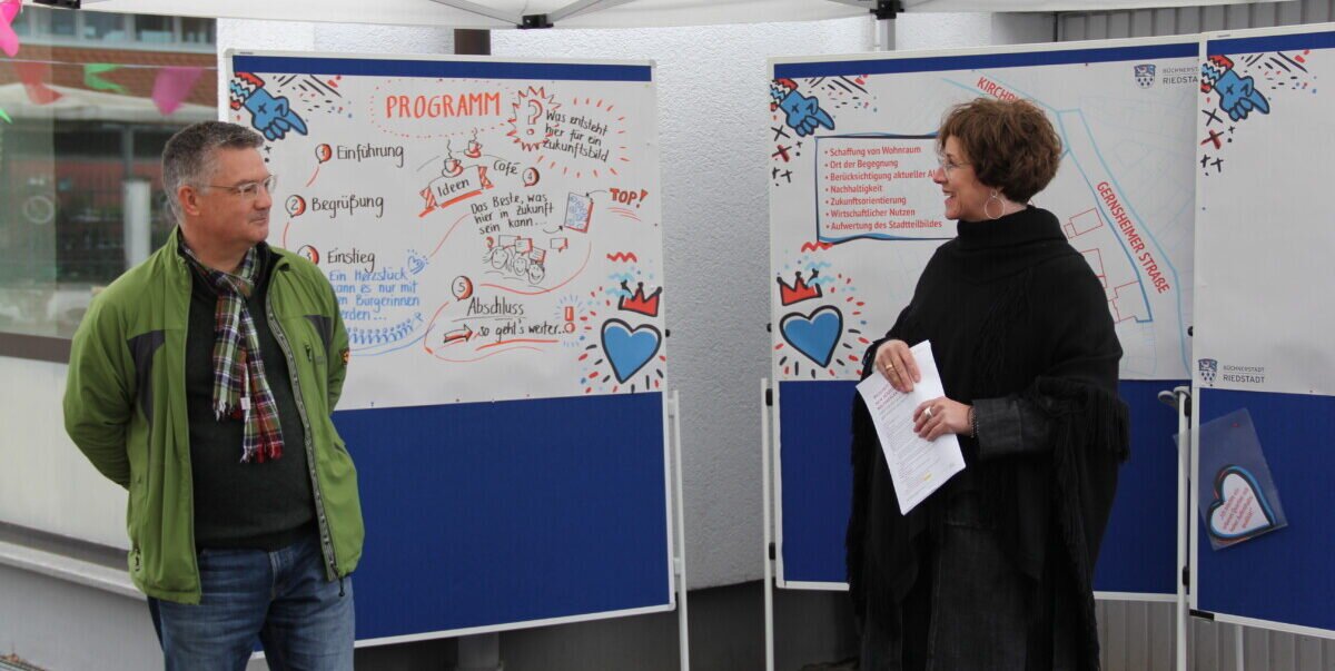 Die Büchnerstadt Riedstadt startete am Samstag, 30. April, direkt am Ort des Geschehens die Bürgerbeteiligung für das Areal rund um das alte Rathaus, zu dem auch die ehemalige Sparkasse und weitere Gebäude gehören. Michael Leimbach und Clarice Milagres, bei der Stadt zuständig für Projektmanagement und Stadtentwicklung, sowie die Prozessbegleiterin Kristina Oldenburg von der Firma Kokonsult, die den Nachmittag moderierte, begrüßten die zahlreichen Teilnehmenden vor dem alten Rathaus. „Heute soll es um Ideen gehen, wollen wir kreativ sein“, erklärte Leimbach. Um dafür eine solide Grundlage zu haben, gab es zu Beginn anhand des Lageplans Informationen zu den einzelnen Gebäuden und von Adelheid Reinhardt, der Ehrenvorsitzenden des Heimat- und Geschichtsvereins, einen spannenden Abriss über die Geschichte des Areals: Denn das erste Wolfskehler Rathaus entstand 1845 an der Stelle, wo über viele Jahre die Sparkasse ihr Domizil hatte. „Ein schönes Gebäude“, wie Reinhardt betonte. Doch es wurde im Oktober 1963 abgerissen und die Gemeindeverwaltung zog in das Gebäude, das seit 1882 die Schule im Ort war. Das Areal davor war der Schulhof, abgetrennt zur Straße hin durch ein schützendes Mäuerchen. Nicht weit davon stand der alte Kindergarten, die „Kinderschule“. Das denkmalgeschützte Gebäude ist heute ein Wohnhaus und im Privatbesitz, kann aber für eine neue Nutzung in die Überlegungen mit einbezogen werden.