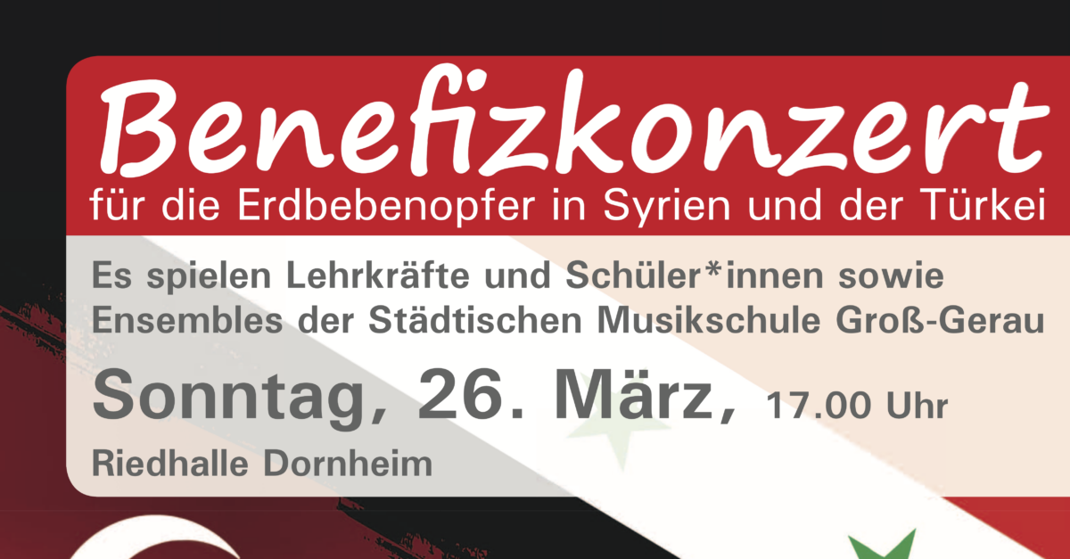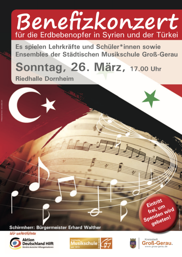 GROSS-GERAU – Am Sonntag, 26. März 2023 lädt die Kreisstadt Groß–Gerau zu einem besonderen musikalischen Event ein: Ein Benefizkonzert für die Erdbebenopfer in Syrien und der Türkei in die Riedhalle in Dornheim.