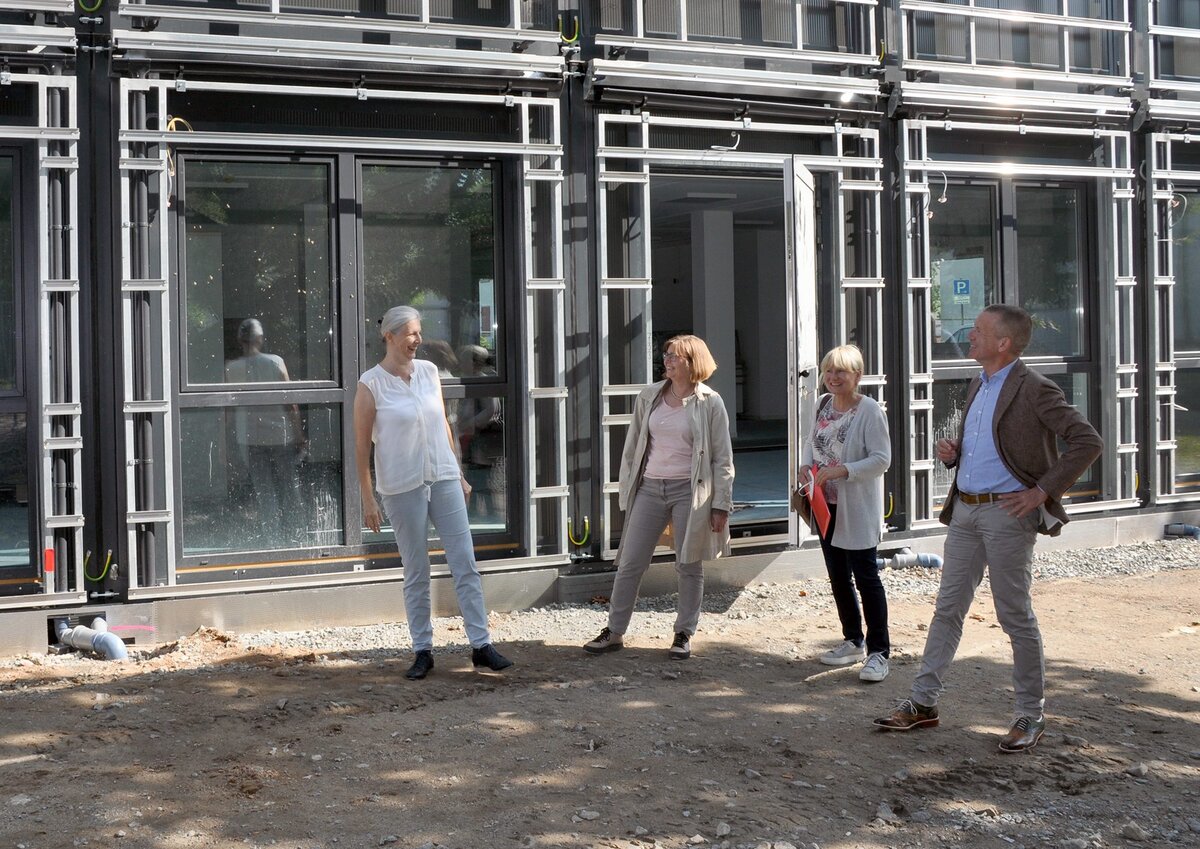 Ortstermin an der Insel-Kühkopf-Schule in Stockstadt am Rhein: Landrat Thomas Will informierte sich über die neue Containeranlage. Mit dabei (von links): Schulleiterin Edith Fritz-Knierim, Gabi Walter-Reichelt, Fachbereichsleiterin Gebäudemanagement, und Architektin Adrienne Mittelstädt. Foto: Kreisverwaltung