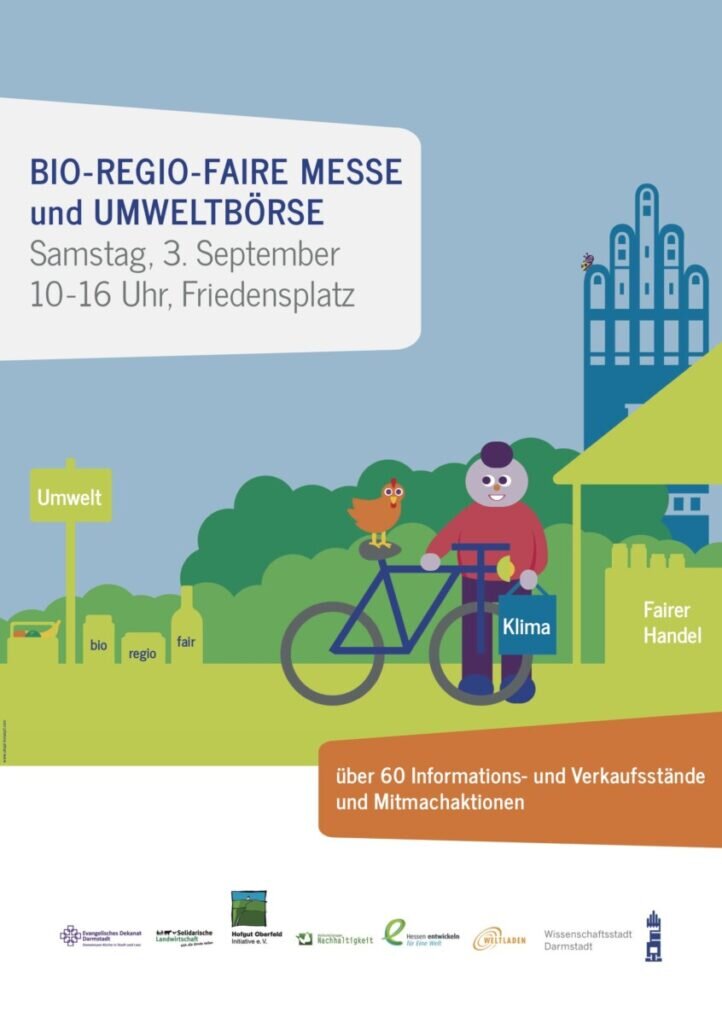 DARMSTADT – Unter dem Motto „Biologisch, regional und fair“ laden die Wissenschaftsstadt Darmstadt, das Evangelische Dekanat Darmstadt und der Weltladen Darmstadt gemeinsam mit Kooperationspartnerinnen und Kooperationspartnern für Samstag, den 3. September 2022, zur bio-regio-fairen Messe und Umweltbörse ein. Zwischen 10 und 16 Uhr können sich Interessierte auf dem Friedensplatz in Darmstadt umfassend zu Umweltthemen informieren. Der Eintritt ist frei.