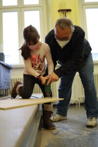 Diesen Gewinnervorschlag bauten Jugendpfleger Kai Faßnacht, Jugendpflegerin Julia Spitzer und FSJler Nick Hammann gemeinsam mit einigen Kindern der Grundschule Erfelden in dem Bau-Workshop, unter ihnen auch zwei der drei Kinder, die den Sieger-Entwurf gemalt hatten. An dem Tag wurde eifrig Maß genommen, gesägt, gebohrt und immer wieder abgeschliffen. Auch die erste Grundierung wurde bereits aufgebracht.