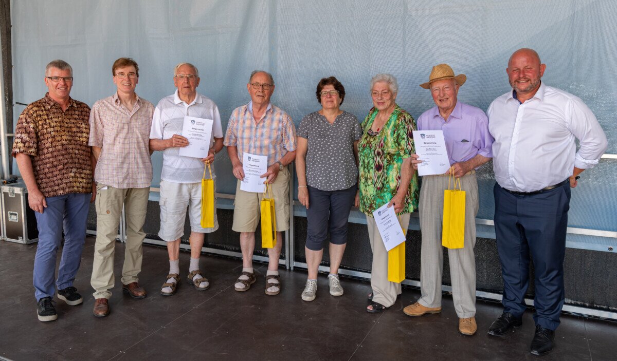 Auch die Chöre sind wichtiger Bestandteil des Riedstädter Vereinslebens und so wurde die Sängerehrung der Stadt eingebettet in das Willkommensfest. Umrahmt in Auftritte des Mix-Dur Chors der Sängervereinigung Wolfskehlen ehrten Bürgermeister Marcus Kretschmann und Erster Stadtrat Ottmar Eberling Annemarie Klust und Walter Glock von der SKG Erfelden für 50 Jahre Gesang sowie Herbert Hamm und Hans Schaffner von der Sängervereinigung Wolfskehlen für 65, beziehungsweise 70 Jahre Gesang.