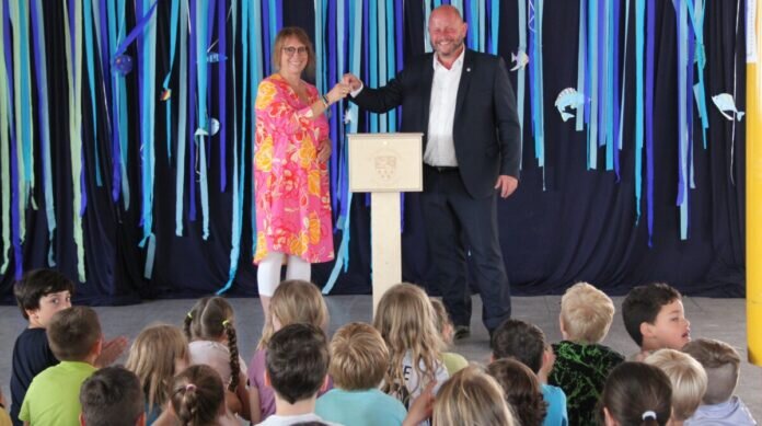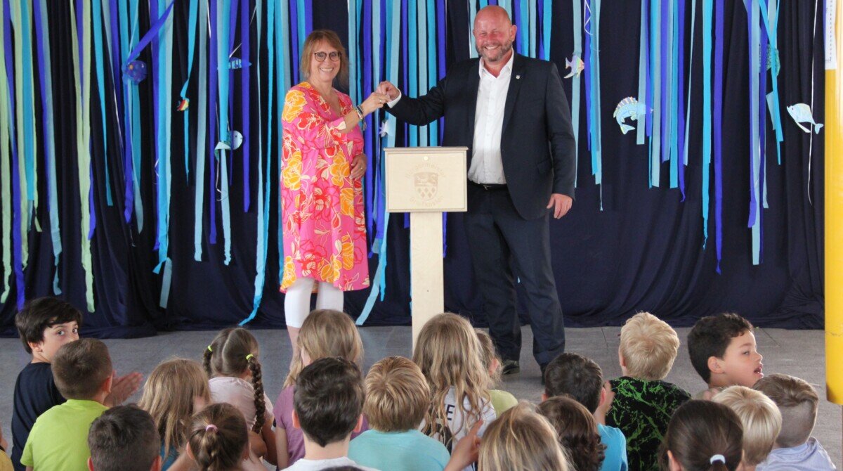 Bürgermeister Marcus Kretschmann bedankt sich fasziniert für diesen musikalischen Einstand und hat im Gegenzug auch etwas mitgebracht: Wie zuvor bereits die Grundschulen in Erfelden und Goddelau, erhält nun auch die Grundschule Wolfskehlen einen Bürgermeister-Briefkasten. Hier können die Schüler*innen in Briefen an den Bürgermeister Wünsche und Anregungen für ihren Stadtteil mitteilen, aber auch auf Negatives hinweisen.