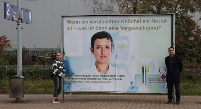 Jede Vergewaltigung ist ein medizinischer Notfall: Darauf weisen derzeit Großplakate in den Kreiskommunen hin, wie hier am Groß-Gerauer Bahnhof. Judith Kolbe, Leiterin des Büros für Frauen und Chancengleichheit der Kreisverwaltung, und Erster Kreisbeigeordneter Adil Oyan stehen für diese Kampagne, die das Projekt „Soforthilfe nach Vergewaltigung“ von Kreis und GPR Klinikum Rüsselsheim noch bekannter machen will. Foto: Kreisverwaltung