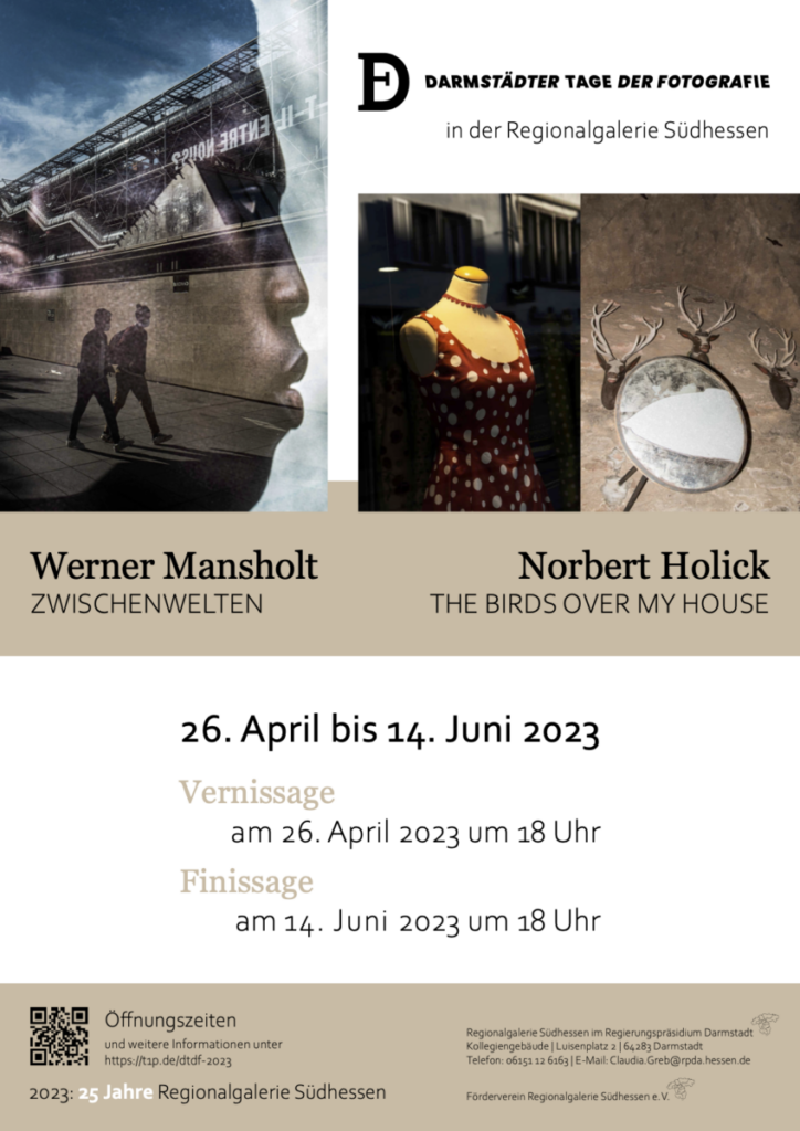 DARMSTADT – Die Regionalgalerie Südhessen im Regierungspräsidium Darmstadt präsentiert in Kooperation mit den Darmstädter Tagen der Fotografie eine Foto-Ausstellung von Werner Mansholt „ZWISCHENWELTEN“ und Norbert Holick „THE BIRDS OVER MY HOUSE“ in den Galerieräumen am Luisenplatz in Darmstadt.