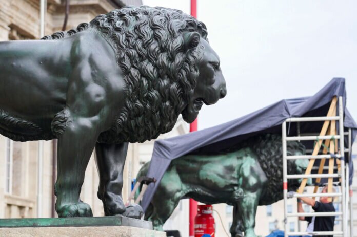 Korrosion kann verschiedene Formen annehmen und auch aggressive Bestandteile enthalten, die sich auf Dauer negativ auf die Oberflächenstruktur einer Bronze auswirkt. Der neue Wachsüberzug schützt die Löwen und lässt sie wieder in neuem alten Glanz erstrahlen.