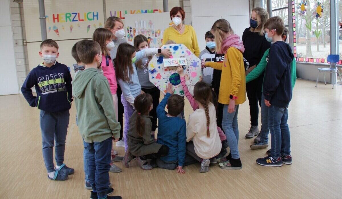 Riedstadt – Er ist fröhlich bunt mit vielen farbigen Klecksen und einer Erdkugel, um die Strichfiguren unterschiedlichster Größe und Farbe Hand in Hand tanzen – und vor allem hat er eine Klappe, auf der unmissverständlich in großen Buchstaben die Aufschrift „Kinderwunsch“ steht: Der neue Briefkasten für die Schülerinnen und Schüler der Grundschule Erfelden wurde nun an seinen Bestimmungsort gebracht und zunächst ausgiebig in der Aula bestaunt, bevor er dann im Schulflur aufgebaut wurde.