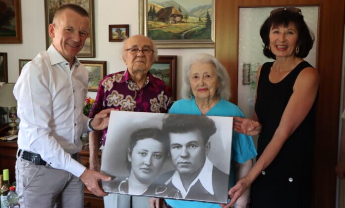 Grund für Landrat Thomas Will und die Rüsselsheimer Stadträtin Renate Meixner-Römer, den Jubilaren am Samstag, 16. Juli, die Glückwünsche von Kreis, Stadt und auch dem Land Hessen zu überbringen. Urkunden und Blumen werden überreicht, die beiden freuen sich sichtlich über den Besuch und die Gratulation. Ihr Sohn, ein Schriftsteller und Übersetzer, der ebenfalls in Rüsselsheim lebt, ist schon da, die Tochter wird noch zur Feier erwartet. Auch Enkelin Daria Nickchen – die nach der Übersiedlung nach Rüsselsheim auf die Immanuel-Kant-Schule gegangen ist – ist aus Anlass der Gnadenhochzeit mit Mann und Kindern gekommen. Sie sind aus Niedersachsen angereist.