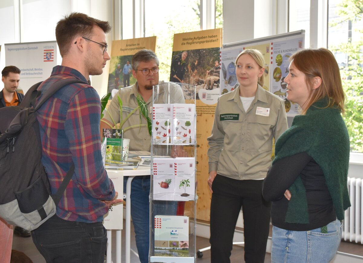 Darmstadt – Von der Regionalplanung über Bauwesen, Verkehr bis hin zu Umwelt, Weinbau, Forsten und Naturschutz haben fünf der acht Abteilungen des RP im Wilhelminenhaus am Standort Darmstadt mehr als 16 verschiedene Fachbereiche vorgestellt. So haben die Mitarbeiterinnen und Mitarbeiter der Abteilung III (Regionalplanung, Bauwesen, Wirtschaft, Verkehr), der drei Umweltabteilungen in Darmstadt, Frankfurt und Wiesbaden sowie der Abteilung V (Landwirtschaft, Weinbau, Forsten, Natur- und Verbraucherschutz) Einblicke in ihre Arbeit gegeben und Perspektiven für die eigene berufliche Laufbahn aufgezeigt. Unter anderem mit Impulsvorträgen zu den verschiedenen Themen, die sehr gut angenommen und besucht waren – teilweise hat der Platz im für bis zu 25 Personen vorgesehenen Ausweichraum für die Vorträge nicht ausgereicht.