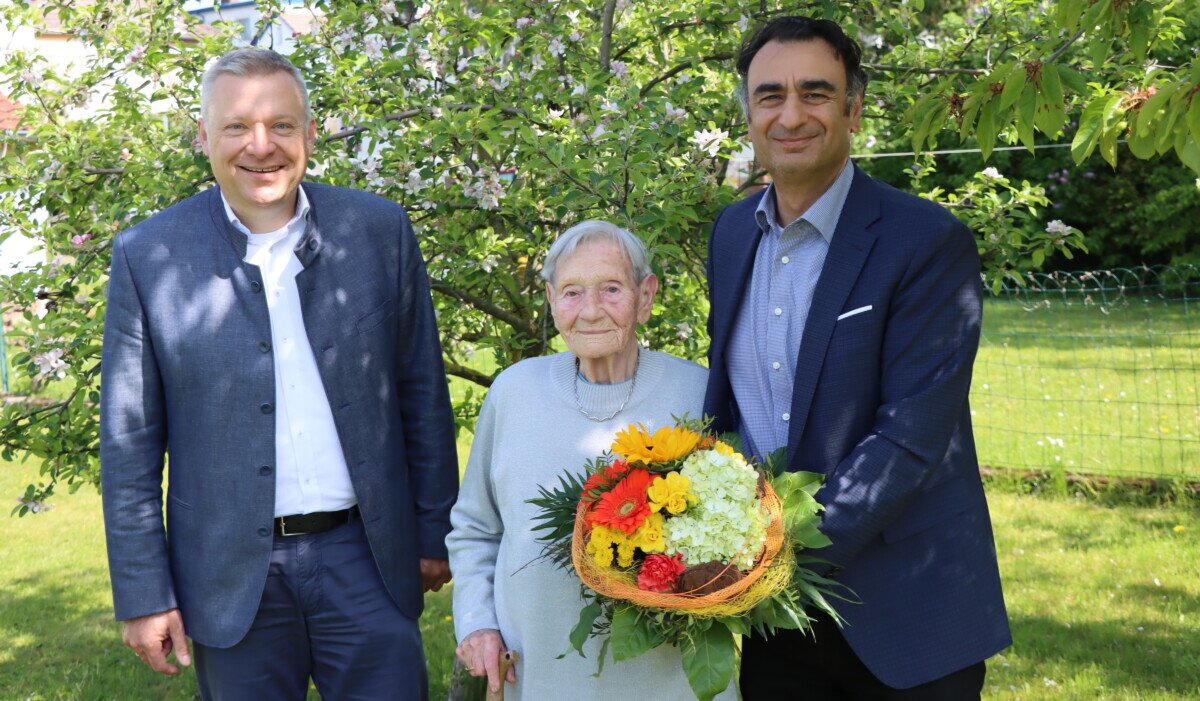 Adil Oyan las den Urkundentext vor und wünschte der Hochbetagten weiterhin Wohlergehen. Die Gäste saßen im Garten mit der Jubilarin beisammen, die ihr Leben in Gernsheim am Rhein verbracht hat. Das Haus, in dem sie noch heute wohnt, baute sie mit ihrem verstorbenen Mann nach dem Zweiten Weltkrieg auf.