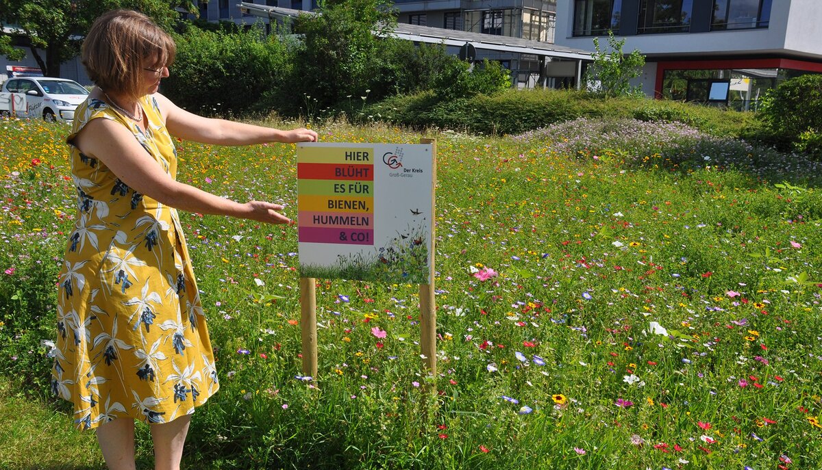 Kreis Groß-Gerau – Die bunten Blumenwiesen am Landratsamt erwecken in diesem Frühsommer Aufsehen. Sie sind aber nicht nur Blickfang und Quell der Freude für Passant*innen, sondern sie gehören zur Umsetzung eines Kreistagsbeschlusses, die biologische Vielfalt an den kreiseigenen Liegenschaften zu erhalten und zu fördern. Das Gebäudemanagement des Kreises kümmert sich um die notwendigen Konzepte für die Freiflächen an den Kreisliegenschaften und ist hocherfreut über die ersten Ergebnisse, wie Fachbereichsleiterin Gabi Walter-Reichelt sagt.