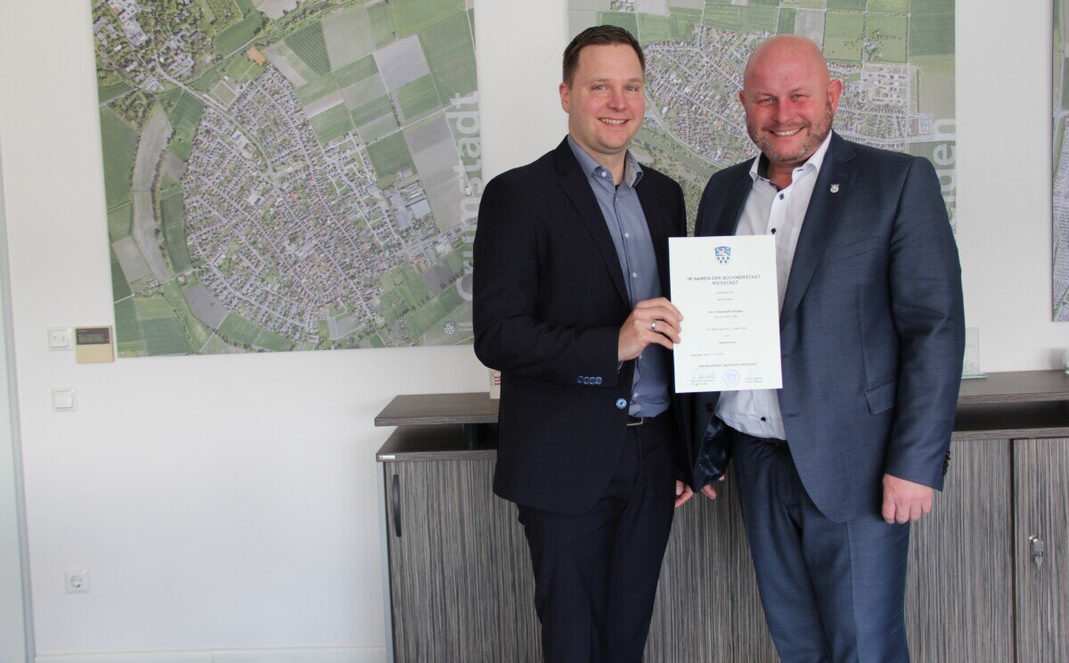 RIEDSTADT – Bürgermeister Marcus Kretschmann hat Alexander Schaper, Leiter des Fachbereichs Finanzen, in einer kleinen Zeremonie die Ernennungsurkunde zum Oberamtsrat überreicht. Damit verbunden ist die Eingruppierung in die Besoldungsgruppe A13.