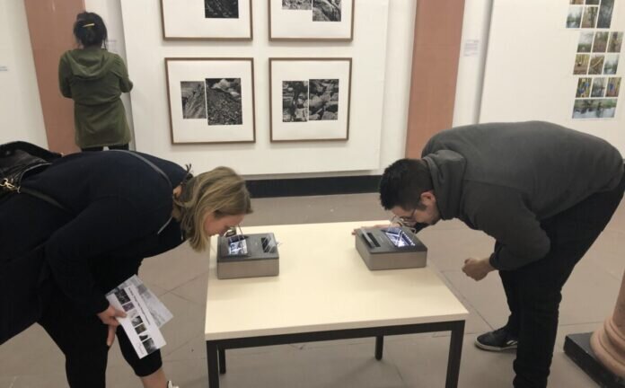 Bild: Gäste der Ausstellung schauen sich Motive von Marcel Rauschkolb im Stereo-Bildbetrachter an. (© RPDA)