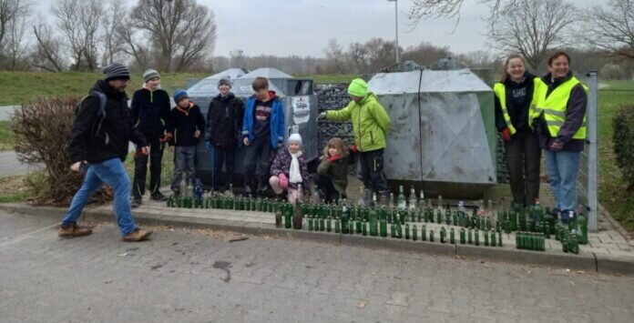 Die fleißigen Sammelnden in Erfelden mit einem Teil der gefundenen Schnapsflaschen. Foto: Jennifer Muth