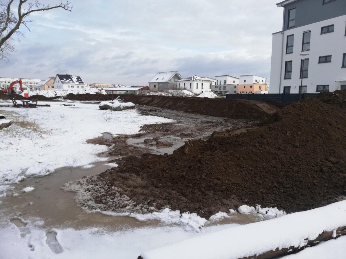 Perspektivisch ist auf dem Areal geplant, einen weiteren öffentlichen Spielplatz zu bauen. In diesem Zusammenhang ist nun Erdmasse in Form von Hügeln auf die Fläche aufgebracht worden, um mit der Gestaltung der Spiel- und Freizeitfläche fortzufahren.
