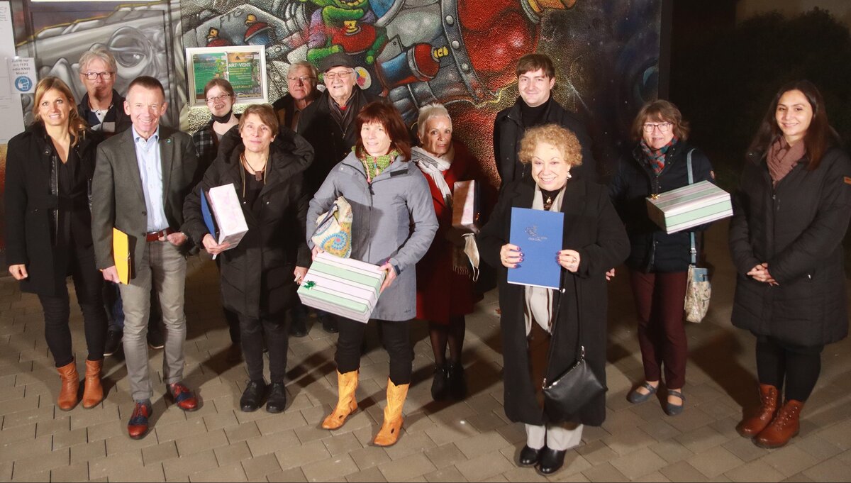 Acht würdige Preisträger*innen sind ausgezeichnet worden – hinter ihnen freilich stehen noch viel mehr Engagierte, jene, die mit ihnen in den Gruppen wirken. Für sie war im Kunstwürfel die Bühne bereitet: Martin Türck, Dr.in Sylvia Schneider, Julia Alcocer Maestre für den Verein T U N e. V. Raunheim – Toleranz unter Nationen, Johanna Katharina Vogel als Vertreterin der AG „NG queer & friends“ des Neuen Gymnasiums Rüsselsheim, Monika Hettwer, Paul-Heinz Steffgen, Claudia Weller und Gerhard Wicht. In Videoclips, die jeweils zu Beginn der Preisübergabe eingespielt wurden, erfuhr das Publikum, für welches Engagement die Personen geehrt wurden. Laudator*innen würdigten darin die Leistungen. Im Anschluss übergaben Patrizia Frank und Landrat Will die Urkunden und als symbolisches Geschenk das Holzschnitzset.