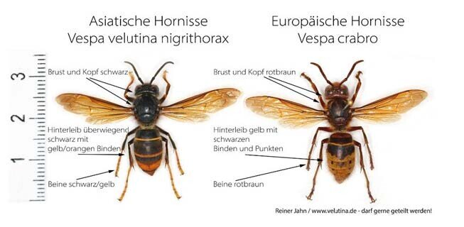 Wie aber erkennt man Asiatische Hornissen? Die beiden Hornissenarten können grundsätzlich bei genauerer Betrachtung anhand der unterschiedlichen Körperfärbung gut voneinander unterschieden werden. Der Kopf und die Brust der europäischen Art sind rotbraun gefärbt, während der Kopf der asiatischen Art schwarz mit orangefarbener Stirn ist. Anhand des Hinterleibs können beide Arten ebenfalls gut voneinander unterschieden werden: Während die heimische Art einen gelben Hinterleib mit schwarzen Binden und Punkten vorweist, ist der des asiatischen Pendants überwiegend schwarz mit gelb-orangefarbenen Binden.