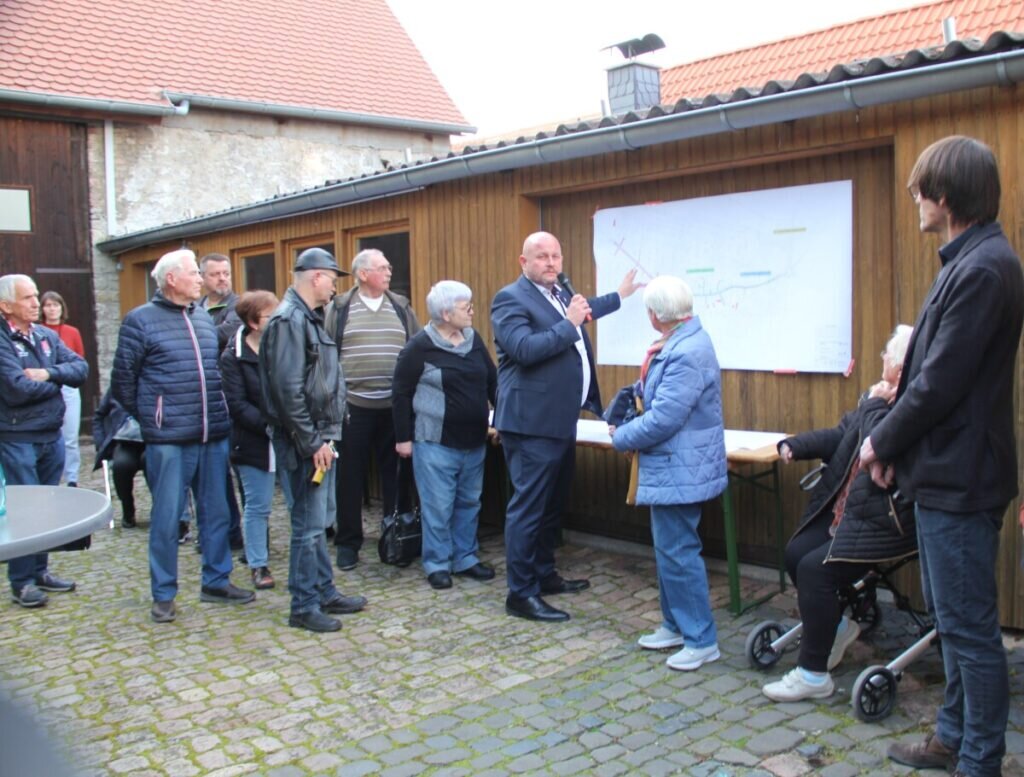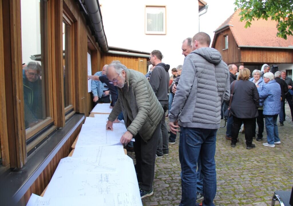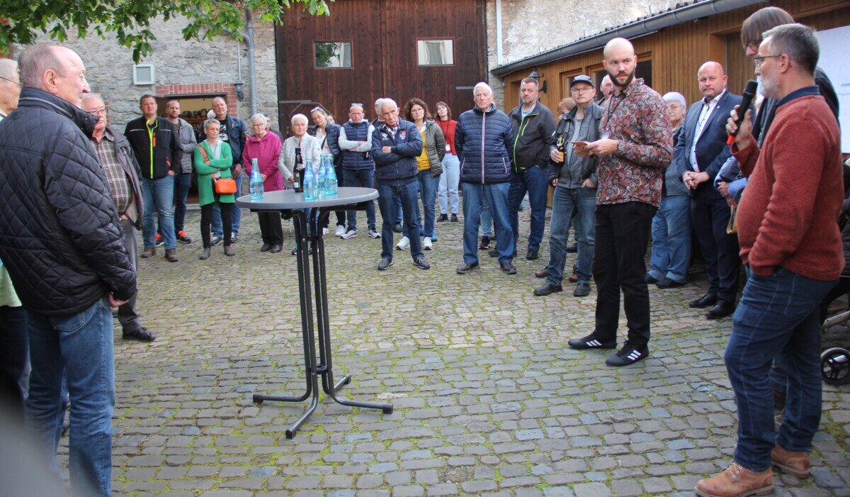 Nach dem Auftakt ging es im lauschigen Hof des Heimatmuseums weiter. Erst in großer Gruppe mit Mikrofon, dann im angeregten Gespräch in Kleingruppen mit Bürgermeister Marcus Kretschmann, den verantwortlichen Mitarbeitenden der Stadtverwaltung und den Fachplanern konnten viele Fragen und Anliegen der Leeheimer*innen besprochen werden.