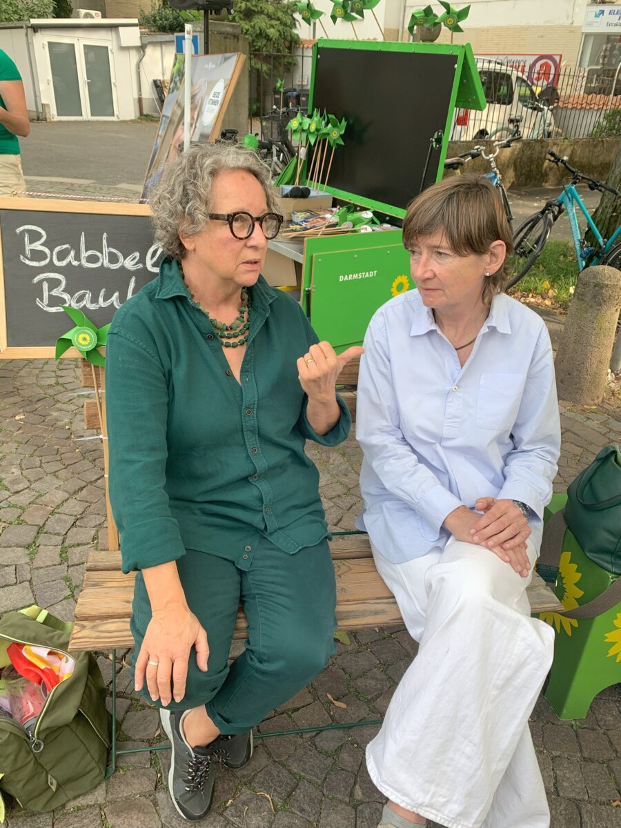 Monika Müller (li.) und Hildegard Förster-Heldmann auf einer GRÜNEN Babbelbank 2023- Foto: Bündnis 90/Die Grünen