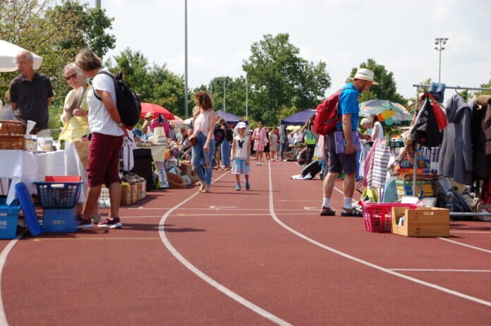 Wo normalerweise Läufer ihre Runden im Christian-Stock-Stadion drehen, hielten beim 6. Seeheimer Flohmarkt wieder zahlreiche Besucher Ausschau nach Flohmarktschätzen. Foto: Matthias Olf / KulturMetzgerei