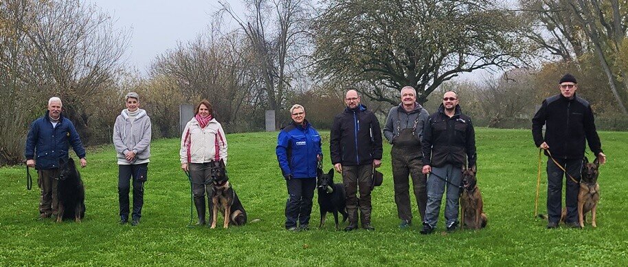 STOCKSTADT – Der Schäferhundeverein Stockstadt, feierte dieses Jahr sein 75 jähriges Jubiläum. Teilnehmer der Prüfung von links: Ralf Pflüger mit Calle, Prüfungsleiterin Conny Ruttloff, Nathalie Costi mit Bendix, Beate Rodenbeck mit Daya, Richter Peter Feldmann, Schutzdiensthelfer Uwe Oberle, Björn Zeißler mit Amey und Karl-Heinz Rösel mit Otto.