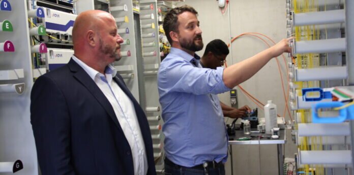 Florian Frommherz, Projektmanager Bau vom Unternehmen Deutsche Glasfaser, steht mit Bürgermeister Marcus Kretschmann im Hauptverteiler für Crumstadt und erläutert das Procedere. Denn im Herzstück des Glasfaserausbaus, der in Crumstadt in der Nähe des Freibads steht, laufen alle Glasfaseranschlüsse der jeweiligen Ortsteile zusammen. Von hier aus werden jetzt nach und nach die einzelnen Gebäude, deren Besitzer sich für schnelles Internet entschieden haben, ans Netz angeschlossen.