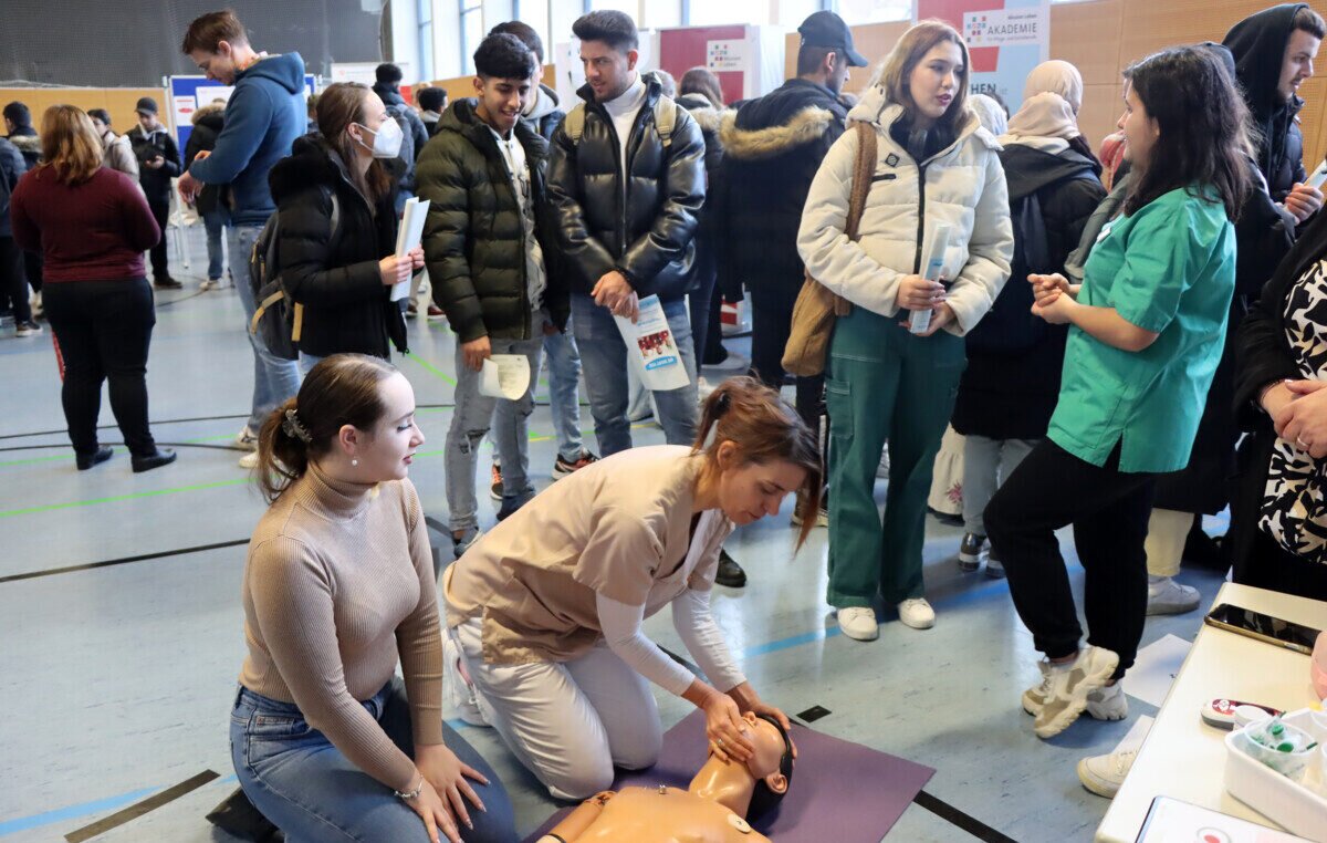 KREIS GROSS-GERAU – An einer am Boden liegenden Puppe übt eine junge Frau Wiederbelebungsmaßnahmen, zwei andere probieren nebenan aus, wie es ist, im Rollstuhl über eine Schwelle zu fahren oder geschoben zu werden, und am nächsten Stand werden medizinische Fachbegriffe mit Hilfe eines Computerprogramms in mehrere Sprachen übersetzt: Beim Pflegeinfotag an den Beruflichen Schulen Groß-Gerau am Donnerstag, 2. Februar, war das Angebot groß, sich über Pflegeberufe, den jeweiligen Ausbildungsgang und die Aufgaben zu informieren.