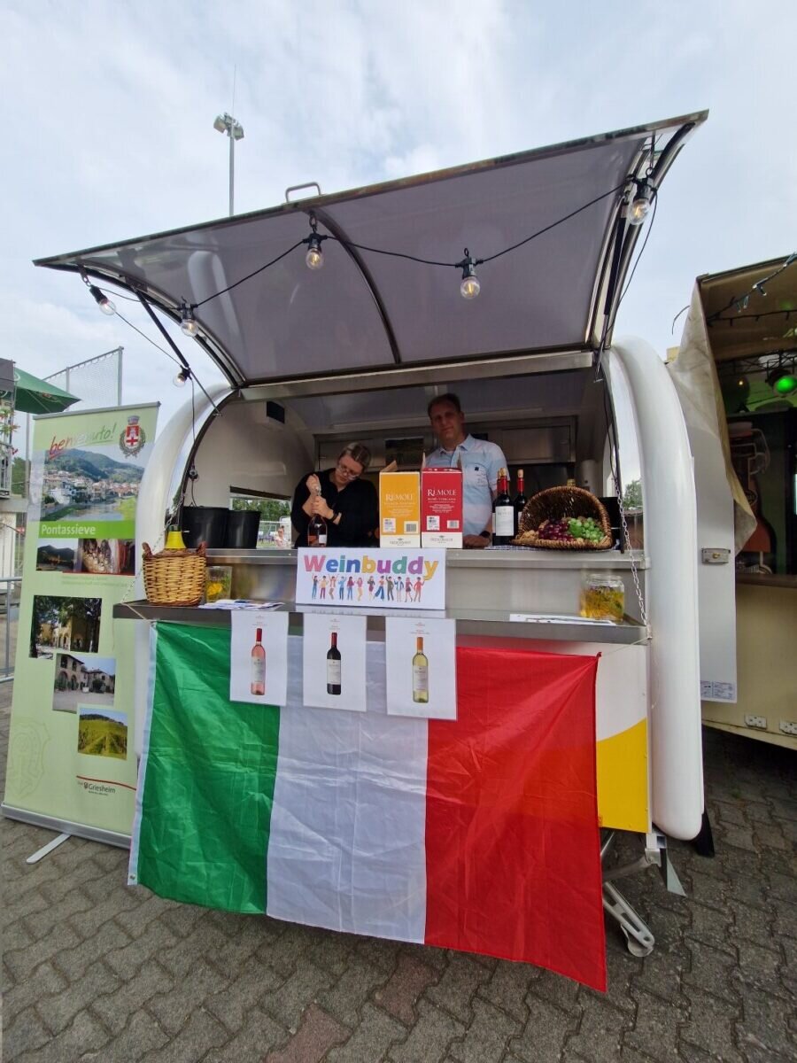 Bei „Sommer, Sonne, Wein“ kommen erstmalig alle drei städtischen Multi-Use-Anhänger, die im Rahmen des Bundesförderprogramms „Zukunftsfähige Innenstädte und Zentren“ angeschafft wurden, zum Einsatz. Besucher*innen bekommen bei Boldizar Obstbrand verschiedene Weine aus der Griesheimer Partnerstadt Pontassieve in Italien angeboten. Passend zum Wein gibt es bei Pippo Faro kleine italienische Leckereien sowie Softdrinks. Und wer lieber Cocktails bevorzugt, bekommt von Jonas Heger und Yannick Merk alkoholische als auch alkoholfreie Varianten gemixt.