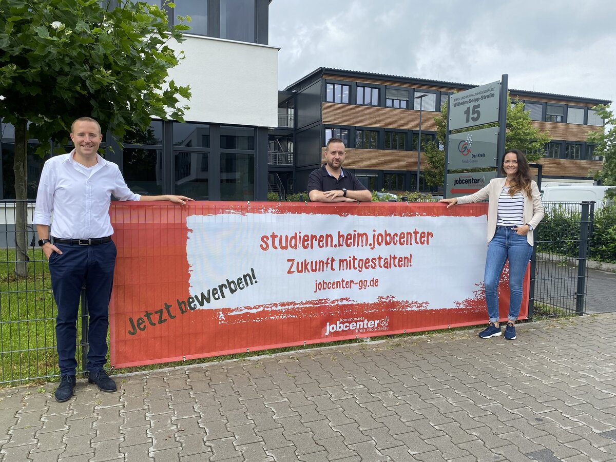 Das Banner vor dem Servicebüro Groß-Gerau ist eine der Werbemaßnahmen für die dualen Studiengänge des Kommunalen Jobcenters Kreis Groß-Gerau (v.l.n.r.: Fabian Anhalt (Öffentlichkeitsarbeit), Nils Pfeffer und Beatrice Klier (beide Ausbildungskoordination und Ansprechpartner für Interessenten und Studierende). Foto: Jobcenter