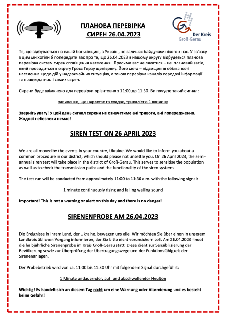 Als nächster Termin für den Probealarm steht an: Mittwoch, 26. April 2023. Der Probebetrieb wird ab 11 Uhr bis 11.30 Uhr mit folgendem Signal durchgeführt: eine Minute andauernder, auf- und abschwellender Heulton mit der Bedeutung: „Rundfunk einschalten, auf Durchsagen achten!“