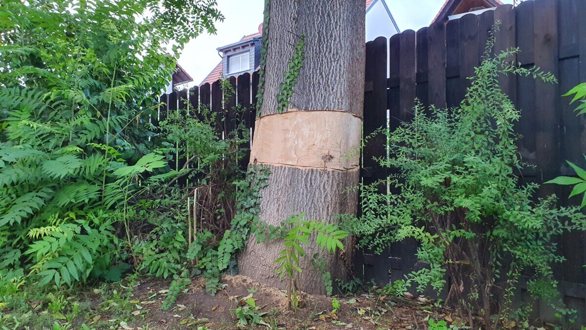Abgeschälte Rinde an Götterbäumen dient dem Umweltschutz