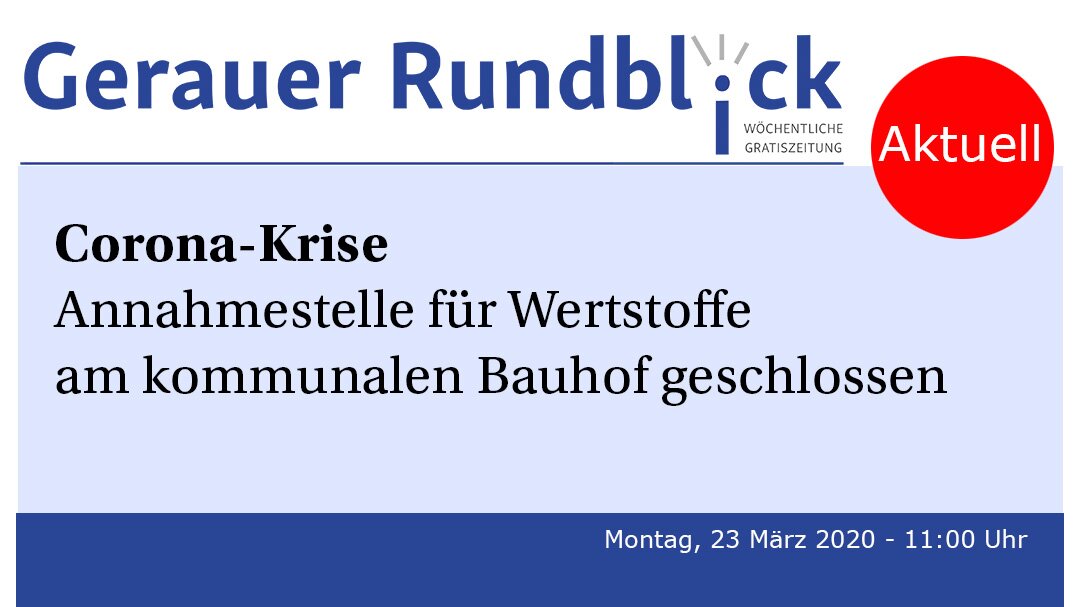 Die Annahmestelle für Wertstoffe auf dem Gelände des kommunalen Bauhofes in der Mühlstraße bleibt bis zunächst einschließlich Montag, 20. April 2020, geschlossen.Die Entscheidung, in den nächsten Wochen keinen Publikumsverkehr auf dem Bauhofgelände zuzulassen, hat die Stadt Groß-Gerau getroffen, um in Zeiten der Coronakrise das Infektionsrisiko auch für die Bauhofmitarbeiter weitestgehend zu minimieren. Ob eine Verlängerung der Bauhof-Schließung notwendig wird, ist derzeit nicht abzusehen.