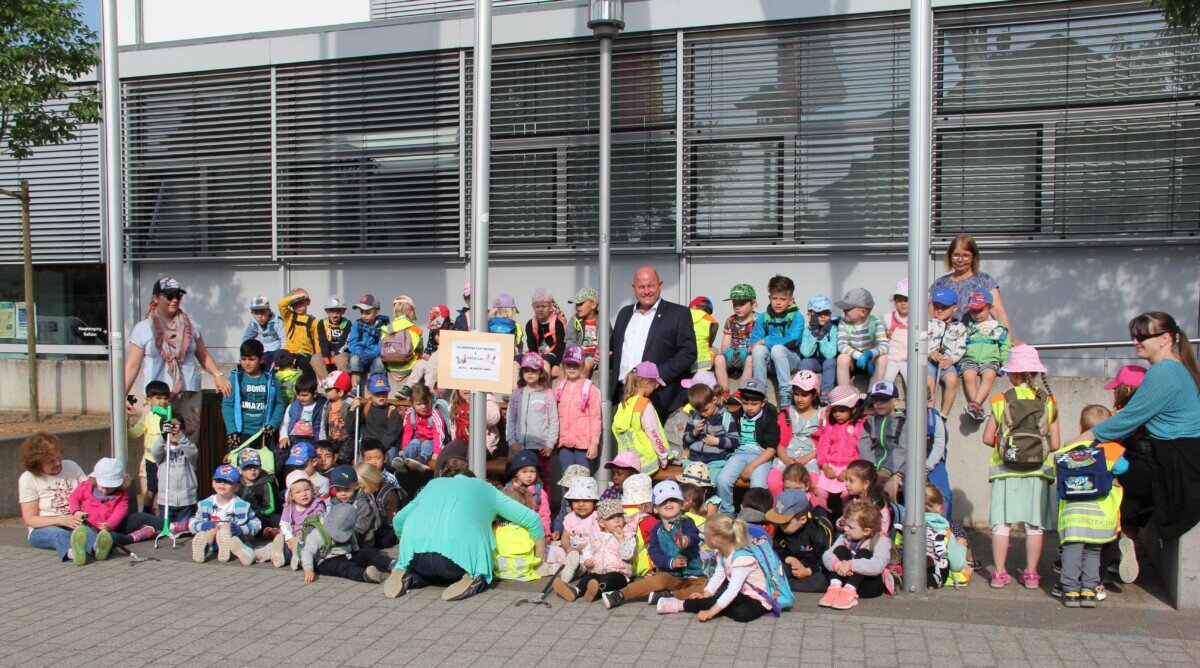 Die erste Station an diesem Vormittag ist der Rathausplatz. Mit großer Begeisterung singen sie Bürgermeister Marcus Kretschmann den eigens einstudierten „Mülltrennsong“ vor und schmettern: „Hast du schon mal Müll getrennt, oder hast du es verpennt? Schau dich um, schau dich um, überall liegt Müll herum!“ Der beeindruckte Verwaltungschef dankt den kleinen Umweltschützern für ihren tollen Einsatz und stellt fest: „Wenn die Erwachsenen ein wenig achtsamer wären und ihren Abfall nicht einfach auf den Boden werfen würden, hättet ihr nicht so viel Arbeit.“
