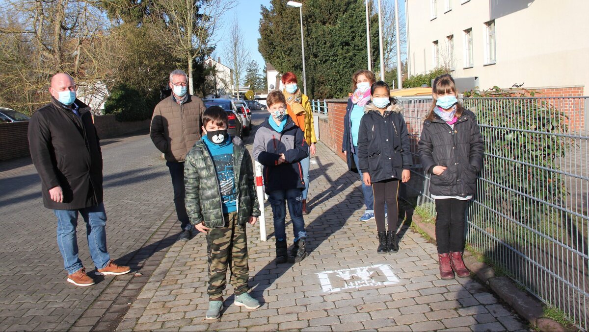 Goddelau – Weiße Markierungen mit zwei Kindern Hand in Hand, zusammen mit der Aufschrift „Kinder Halt“ sowie „Vorsicht“ sind an vielen Stellen auf Gehwegen in Riedstadt-Goddelau zu sehen. Emily, Nitisat, Ibrahim und Ben zeigen beim Ortstermin mit Bürgermeister Marcus Kretschmann, Frank Schaffner vom Fachbereich Öffentliche Sicherheit und Ordnung der Büchnerstadt Riedstadt sowie Lehrerin Steffy Steuernagel und Konrektorin Anette Krauskopf den Haltepunkt, der sich direkt vor der Georg-Büchner-Schule befindet.