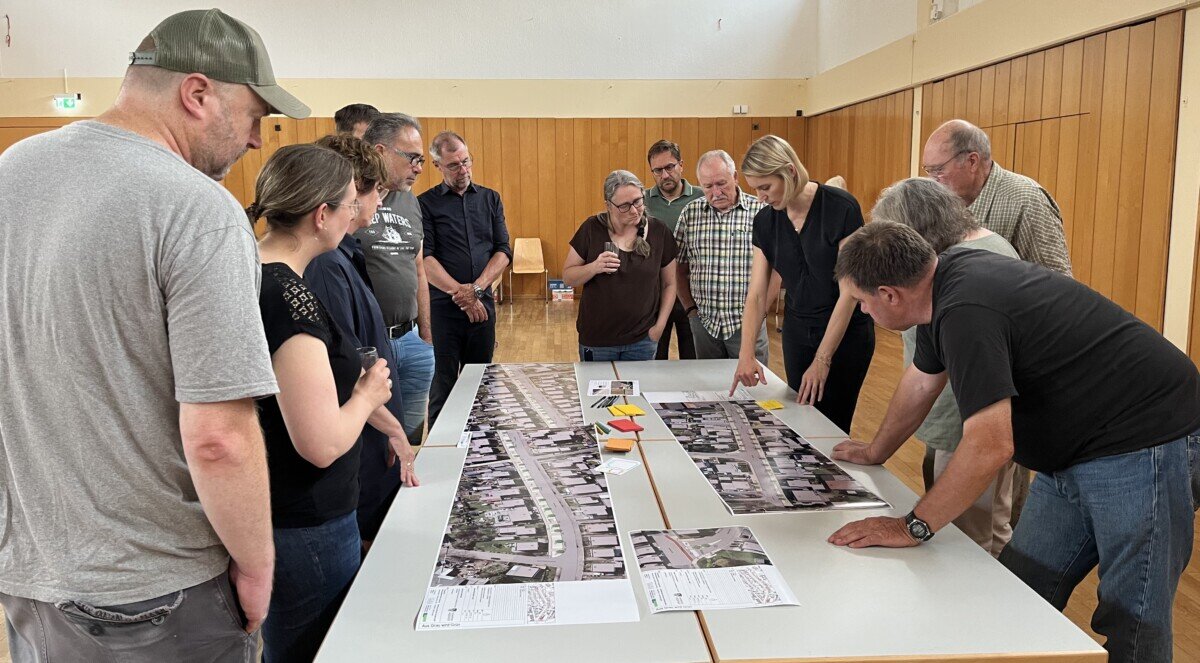In lockerer Atmosphäre, kulinarisch bestens versorgt von den Landfrauen, wurde das neue Konzept der Straßenumgestaltung nach dem Motto „Aus Grau wird Grün“ angeschaut. An Thementischen wurden Baumportraits und Unterpflanzungen, die besonders trocken- und hitzeverträglich sind, vorgestellt. Baumarten konnten priorisiert werden, so dass ein Meinungsbild entstand. Unter anderem der Eisenholzbaum fand Gefallen. Auch Unterpflanzungen, die zu jeder Jahreszeit etwas Blühendes, Vitales bieten, wurden begrüßt. Dann wur-den die Flächen im Lageplan betrachtet, wie sie künftig aufgeteilt sein sollen, Fahrbahn, Geh-wege, Pflanzbeete und Ein-/ Ausfahrten.