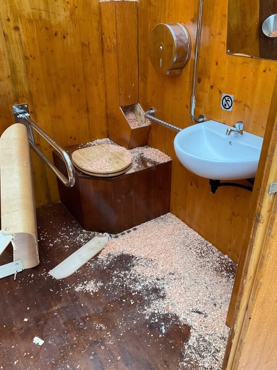 Das barrierefreie Kompost WC ist Teil der inklusiven Spielplatzumgestaltung und wird teils wöchentlich demoliert. Aufgewickeltes Toilettenpapier, das Holzflex wird im Raum verteilt oder der Wickeltisch aus der Verankerung gerissen und kurz und klein geschlagen.