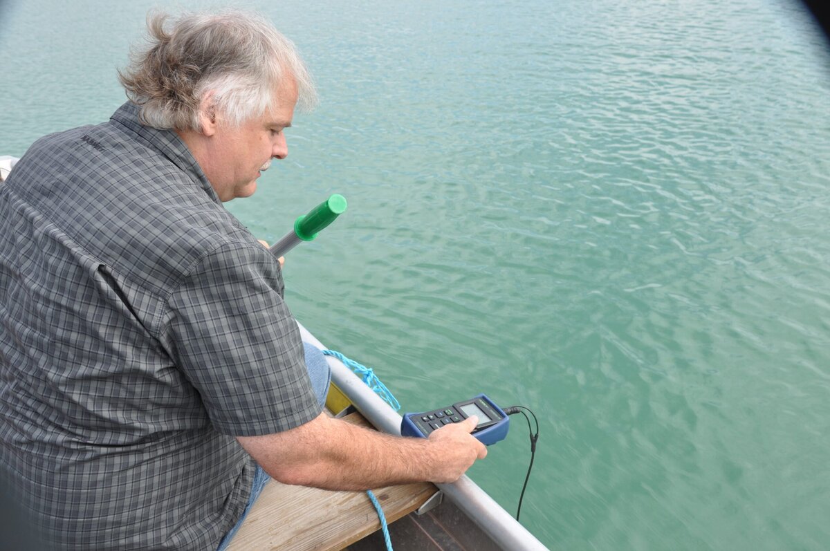 Die Prozedur ist simpel: Der Wissenschaftler Dr. Fecher fährt mit dem Boot gut 30 Meter aufs Wasser und entnimmt dort aus einem Meter Tiefe mit einem zuvor sterilisierten Fläschchen eine Wasserprobe. Zugleich misst er die Temperatur. Mehr passiert vor Ort nicht.