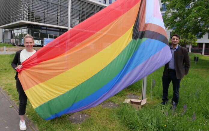 KREIS GROSS-GERAU – Erster Kreisbeigeordneter Adil Oyan hat am Mittwoch, 17. Mai 2023, zusammen mit Judith Kolbe, der Leiterin des Büros für Frauen und Chancengleichheit des Kreises Groß-Gerau, die „Progressiv Pride Flag“ vor dem Kreishaus gehisst.