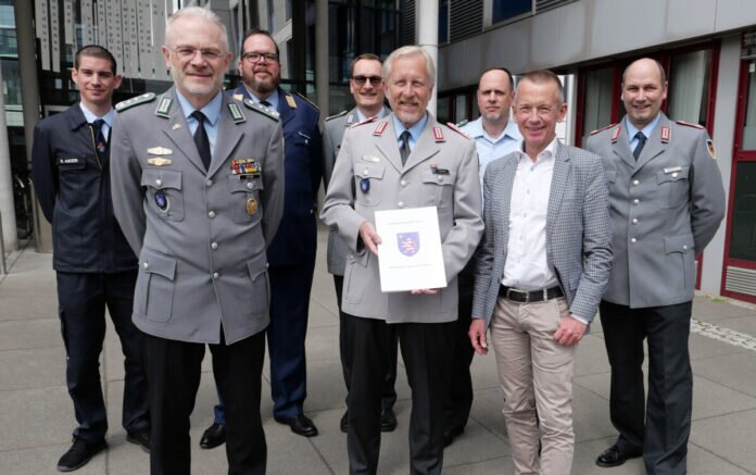 KREIS GROSS-GERAU – In einer kleinen Feierstunde im Landratsamt Groß-Gerau hat Oberst Siegfried Zeyer als Kommandeur des Landeskommandos Hessen im Beisein von Landrat Thomas Will die Entbindungsurkunde aus dem Reservedienst der Bundeswehr an Oberstleutnant Walter Neuert überreicht.
