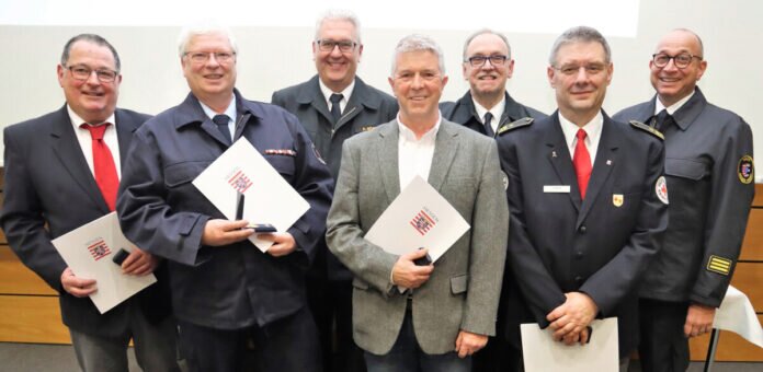 Fünf Mal 40 Jahre Katastrophenschutz: Kreisbrandinspektor Friedrich Schmidt zeichnet fünf Männer mit der goldenen Katastrophenschutzmedaille des Landes Hessen aus (von links): Hans Reinheimer, Kai-Uwe Nölle, Andreas Möstl (Fachdienstleitung Gefahrenabwehr), Rudolf Grein, Michael Kämpfer, Jürgen Kraft und Kreisbrandinspektor Friedrich Schmidt. Bild: Kreisverwaltung