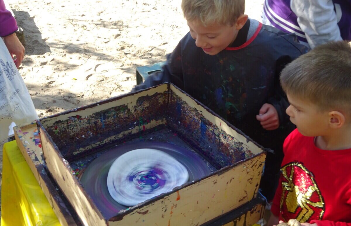 Eine besondere Attraktivität war die Farbschleuder, mit der viele kreative Werke entstanden. Auch die Stationen Wurfkastanien basteln, Sackhüpfen und Seifenblasen haben den Kindern viel Spaß gemacht.