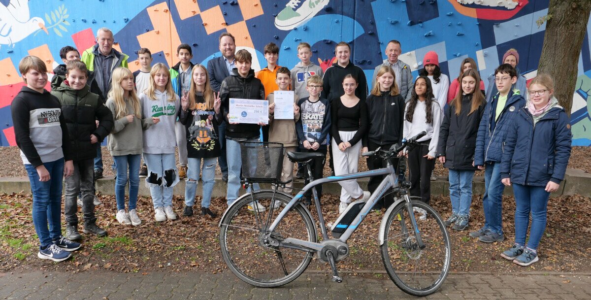 Landrat Thomas Will hat jetzt stellvertretend für die Schule die Klasse 6e mit Klassenlehrerin Anke Plank mit einer Urkunde und einem Preisgeld von 250 Euro ausgezeichnet. Herausragend die Rad-Begeisterung an der Schule. Insgesamt 307 Radelnde, knapp ein Drittel der Schülerschaft, haben sich am Kilometer-Sammeln beteiligt.