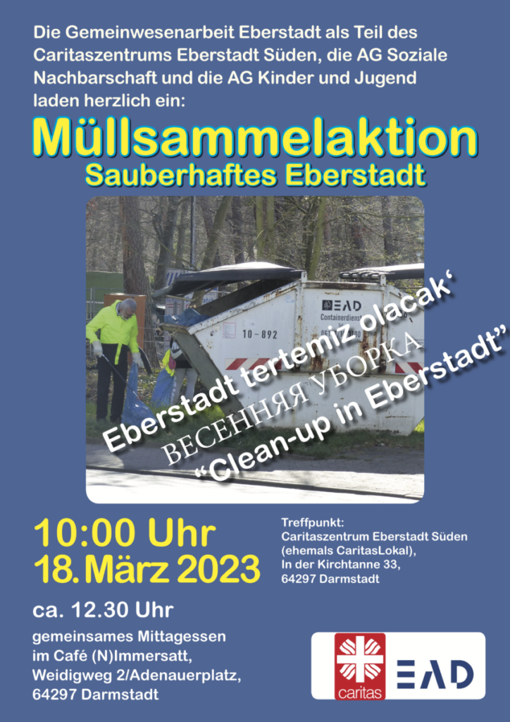 Treffpunkt ist vor dem Caritaszentrum Eberstadt Süden (ehemals CaritasLokal), In der Kirchtanne 33, 64297 Darmstadt. Auch in diesem Jahr stellt der EAD wieder Materialien wie Zangen, Müllsäcke, Handschuhe und Warnwesten zur Verfügung und sorgt für die kostenlose Entsorgung. Diese werden um 10:00 Uhr am oben genannten Treffpunkt an die Helfenden ausgeteilt.