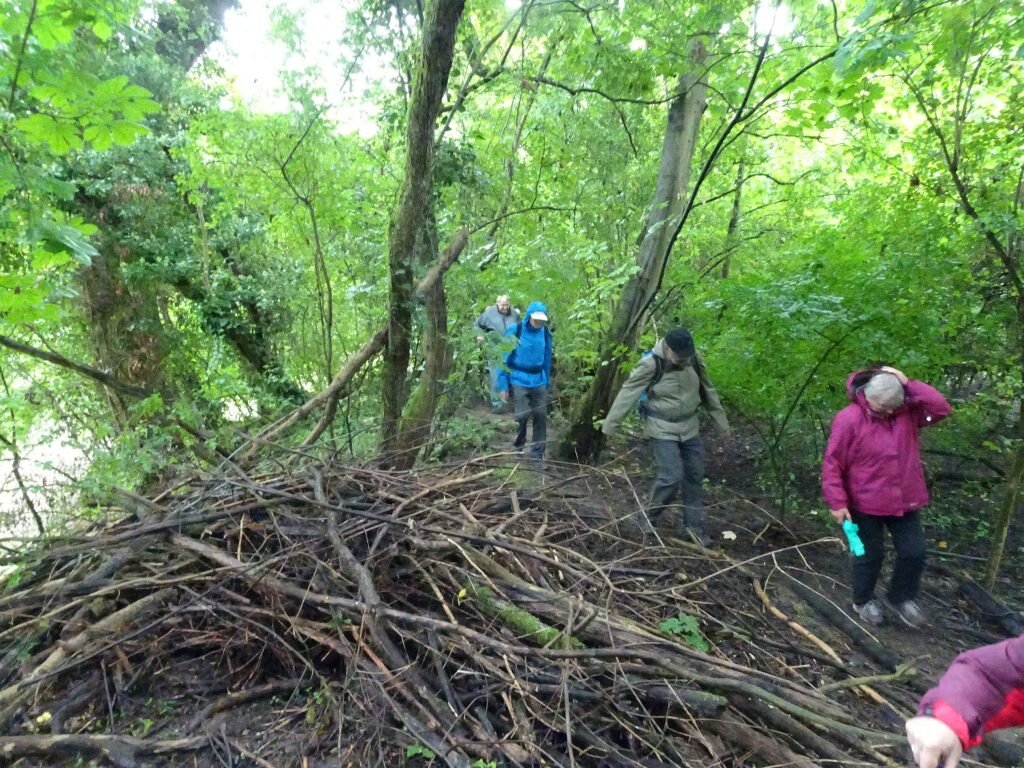 OWK-Naturschutzwart Thomas Arnold hatte schon Proviant zur Stärkung bereitgestellt und mit einer bekannten Melodie auf seiner Mundharmonika lud er die OWK’ler zur Wanderung ein. An einem Kolk vorbei, auf dessen grüner Wasseroberfläche zwei Schwäne geruhsam den Vorbeimarschierenden zusahen, lief ein Teil der Gruppe durch den dichten „Dschungel“, während sich der Rest auf breiten Weg durch den Auenwald bewegte. Unterwegs gab Arnold zu Pflanzen, wie Clematis, auch Waldrebe genannt, indischem und europäischem Springkraut Erläuterungen. Sogar wurde hin und wieder eine Spargelpflanze in der unberührten Natur entdeckt. Auch Vögel, wie der Schwarzstorch oder Reiher, wurden gesichtet. Wissenswertes konnte auch auf Stelen nachgelesen werden.